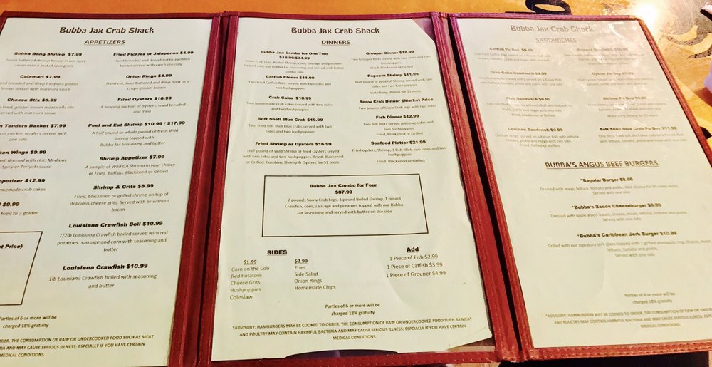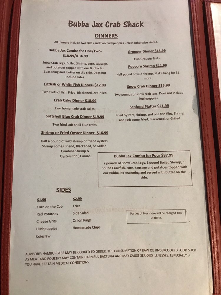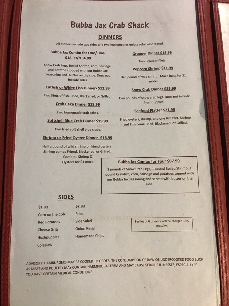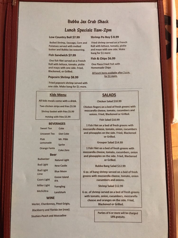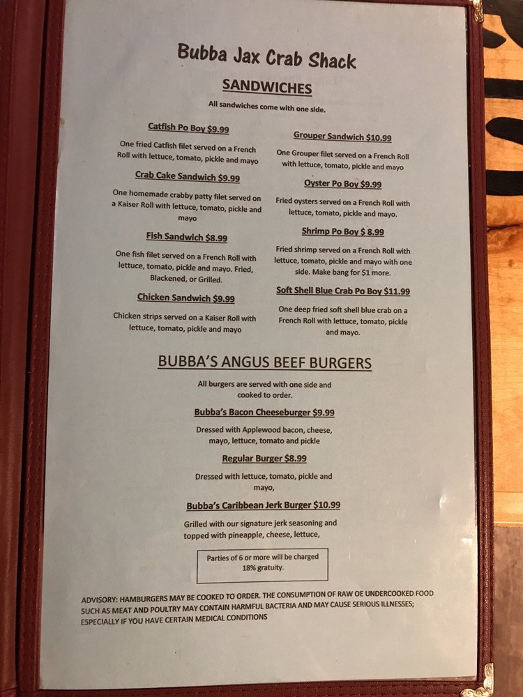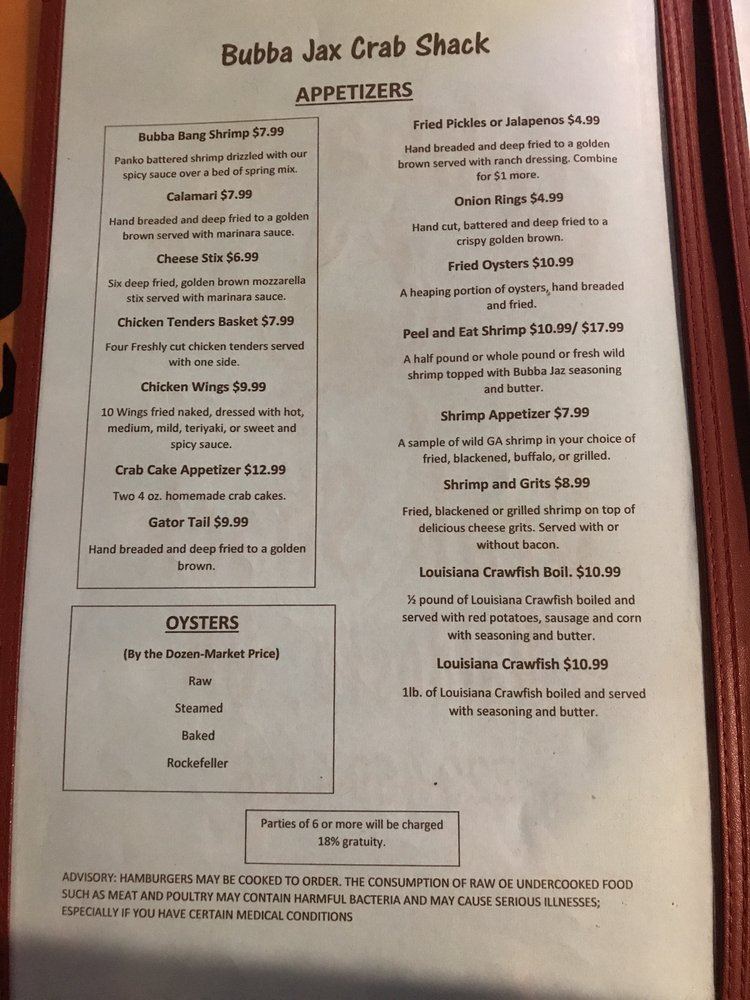 Bubba Jax Crab Shack offers a casual dining experience with a focus on American cuisine, burgers, and seafood. The menu includes a variety of appetizers like hand-breaded calamari and fried pickles, along with sandwiches such as the Grouper and Crab Cake options. The Angus Beef Burgers, like the Bubba Burger and Bacon Cheeseburger, are a highlight and come with a choice of side. Customers rave about the friendly service and quick food delivery, with standout dishes like the low country boil, fried green tomatoes, and gator tails receiving high praise. The atmosphere is described as casual and welcoming, making it a great spot for lunch or dinner. With convenient amenities like outdoor seating, Wi-Fi, and ample parking, Bubba Jax Crab Shack is a must-visit for those passing through Valdosta, GA.